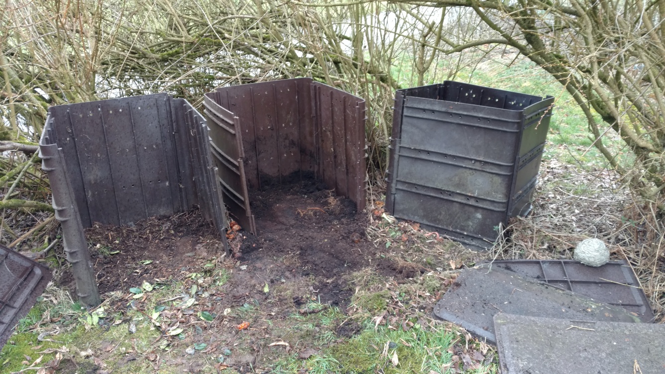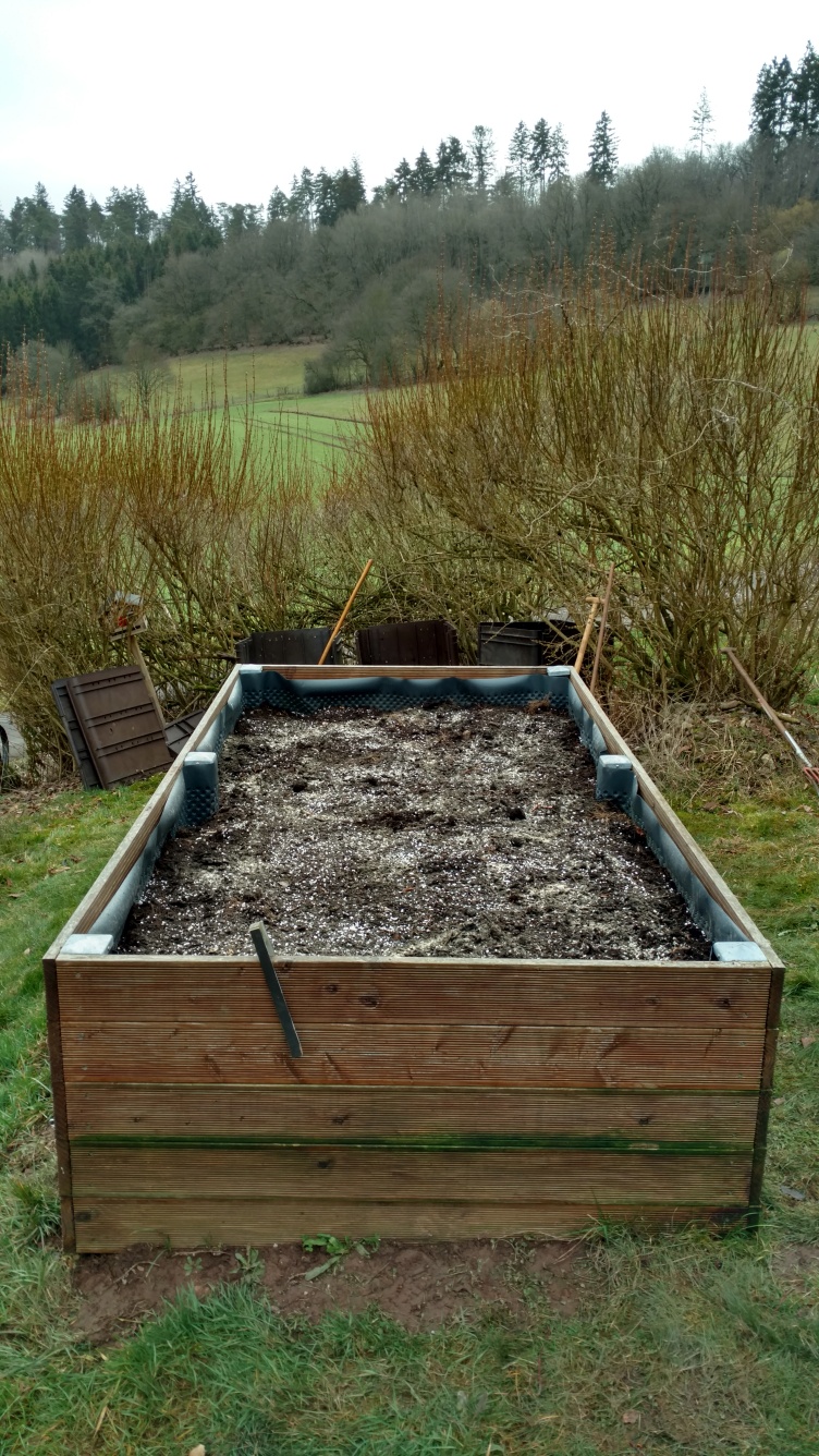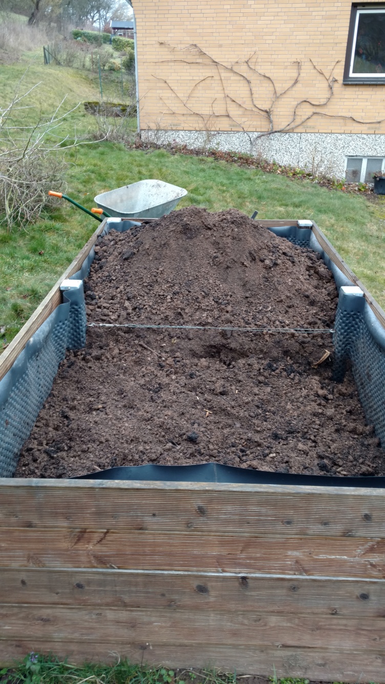 Hälftenweise Erde bis auf Holzeinlage runter zur anderen Seite geschippt. Aufgefüllt mit Kompostinhalt, hauptsächlich geschredderter Holzschnitt, und auf der kompostseitigen Hälfte etwas Grasschnitt vom letzten Jahr. Erde wieder drauf.