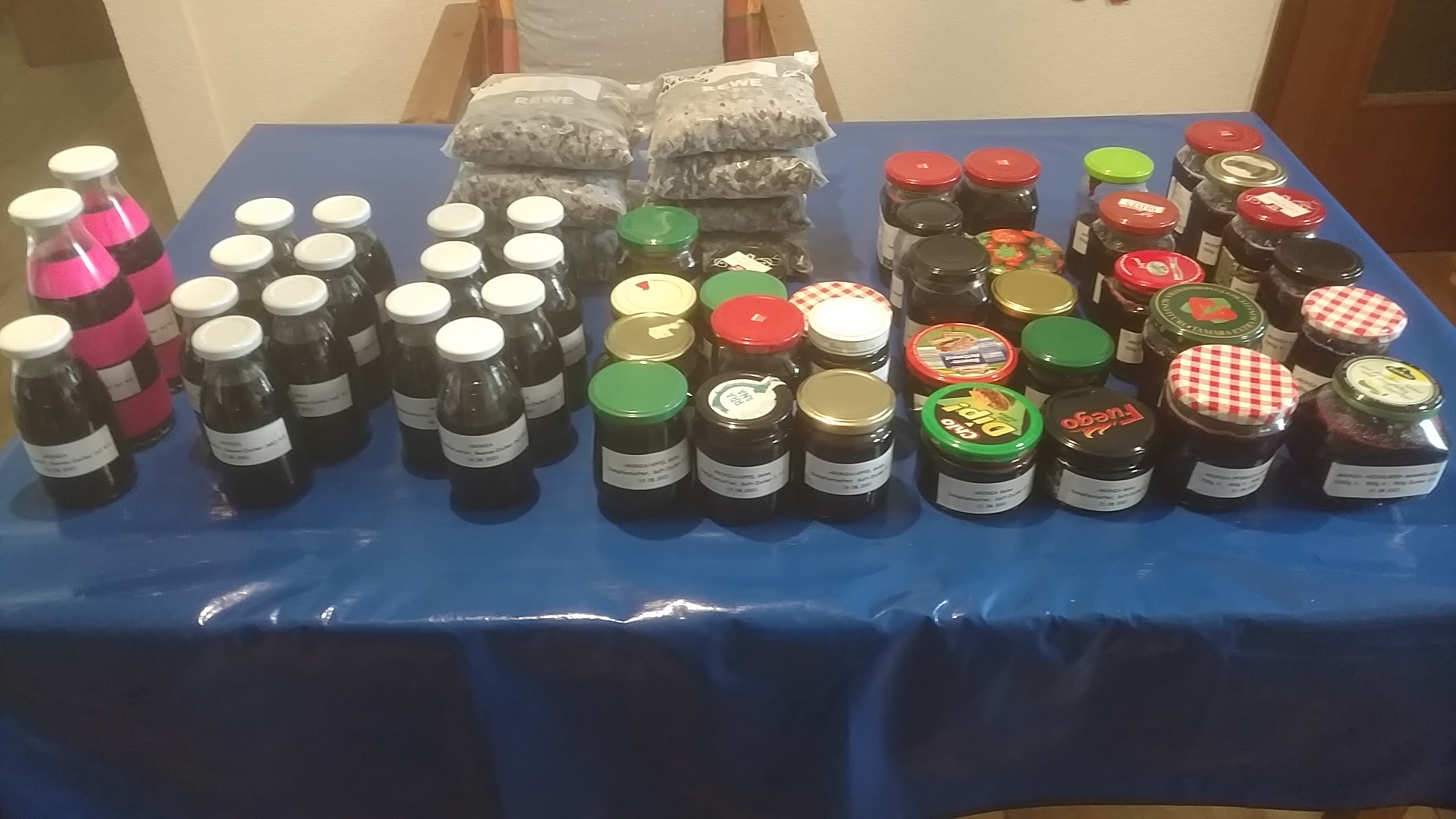 - 1,7 kg Aronia + 200 g weißer Zucker + 200 g brauner Zucker dampfentsaftet => 1,75 l Saft