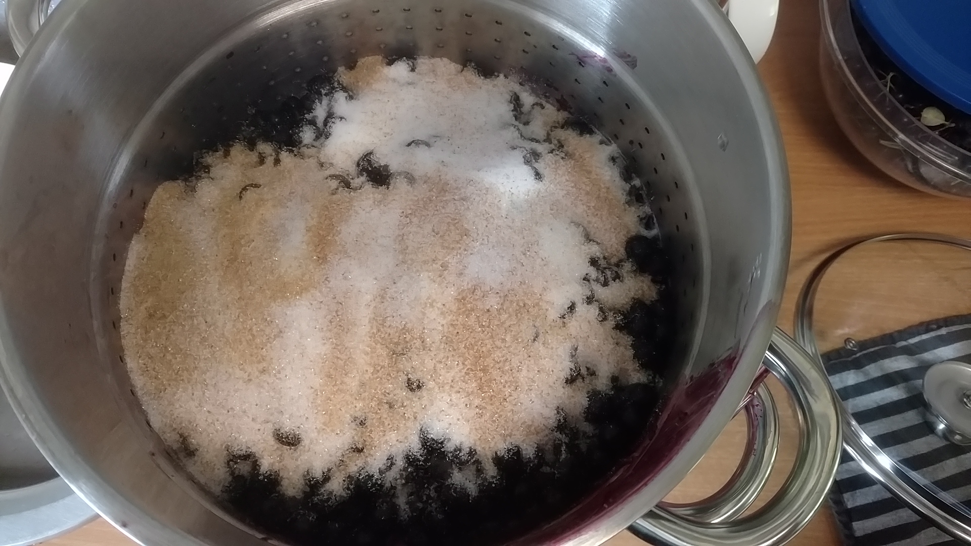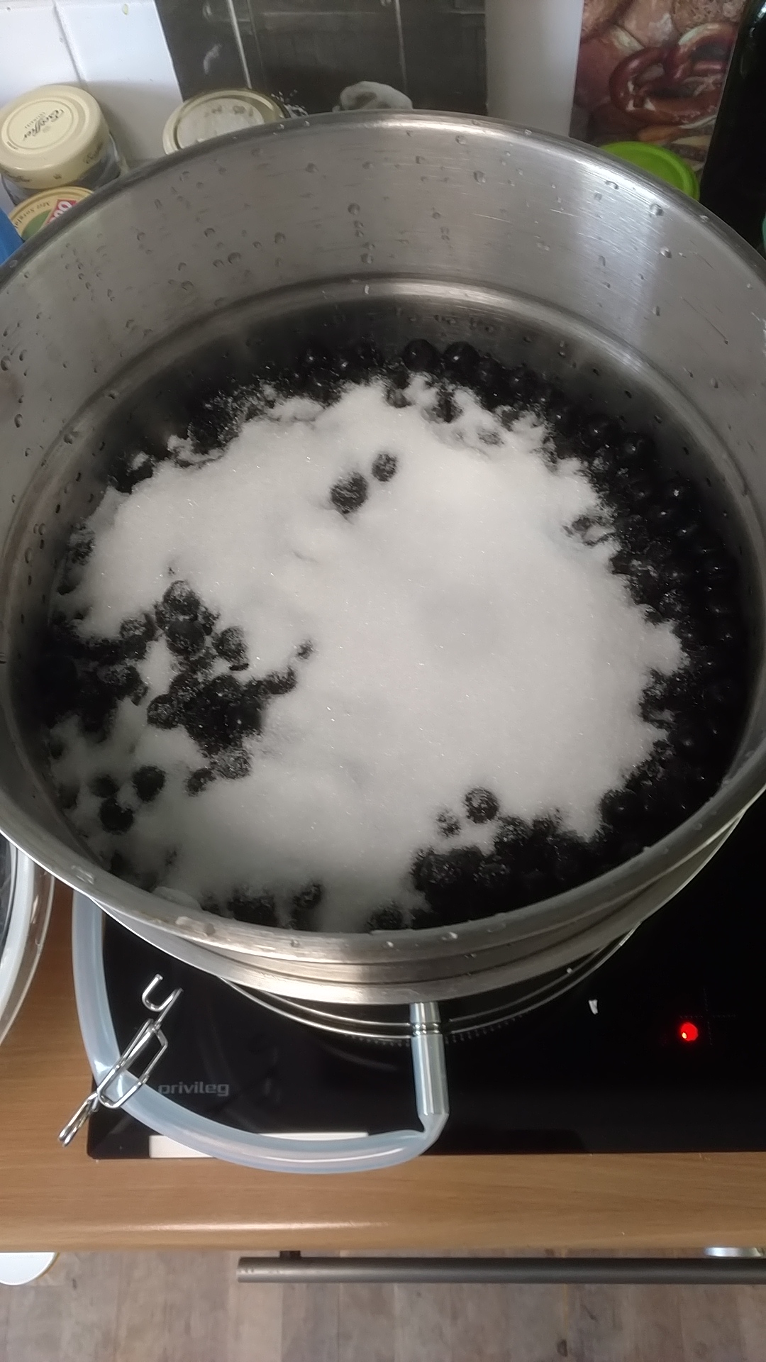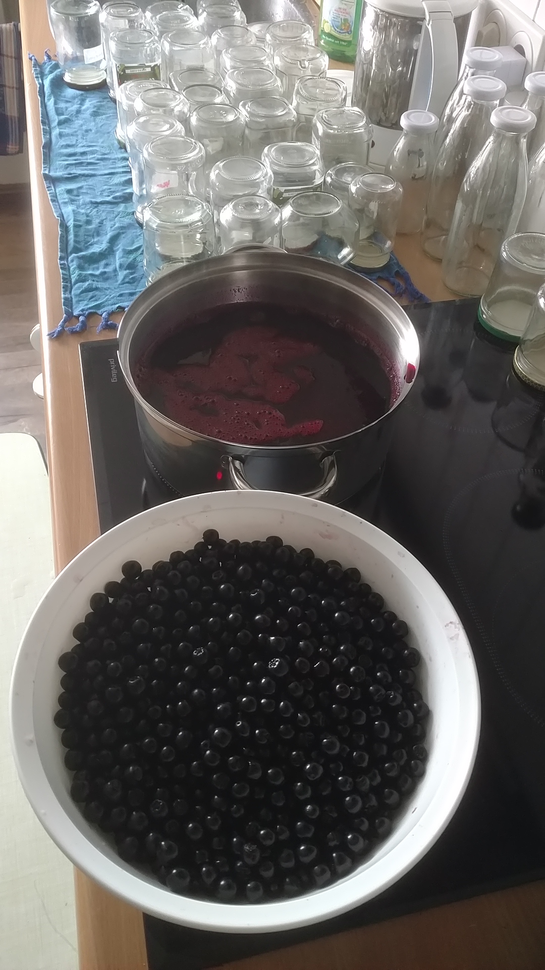 - 1 kg Aronia + 500 g Heidelbeeren + 500 g Gelierzucker 2:1 10 Minuten gekocht => 6 Gläser Aronia/Heidelbeer Marmelade
